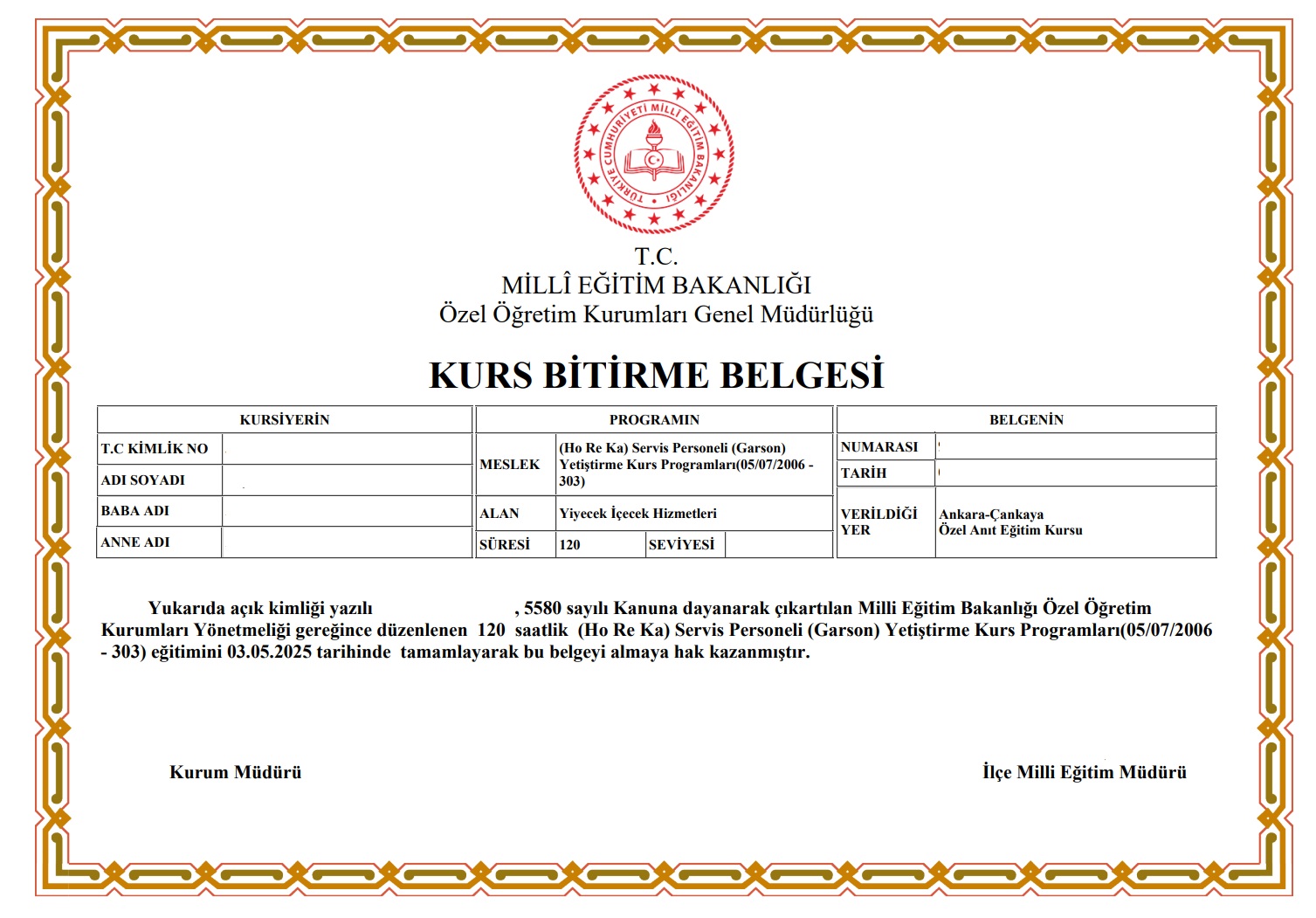 Anıt Eğitim çatısı altında verilen bu eğitimler, katılımcıların yiyecek ve içecek alanında faaliyet gösteren işletmelerde servis öncesi, servis anı ve servis sonrası tüm süreçlere hakim olmasını hedefler. Programın temel gayesi, bu alanda kariyer planlayan bireylerin MEB onaylı ve uluslararası alanda tanınan bir sertifika ile yetkinliklerini belgelemeleridir. Ankara garsonluk kursu arayışında olanlar için Anıt Eğitim, modern eğitim metotları ve kişiye özel program seçenekleriyle öne çıkar. Alınacak MEB onaylı servis elemanı sertifikası, kariyer hedeflerinize ulaşmanızda size geniş kapılar aralayacaktır. Bu sayede yiyecek ve içecek sektörünün sunduğu zengin iş fırsatlarından yararlanabilirsiniz.